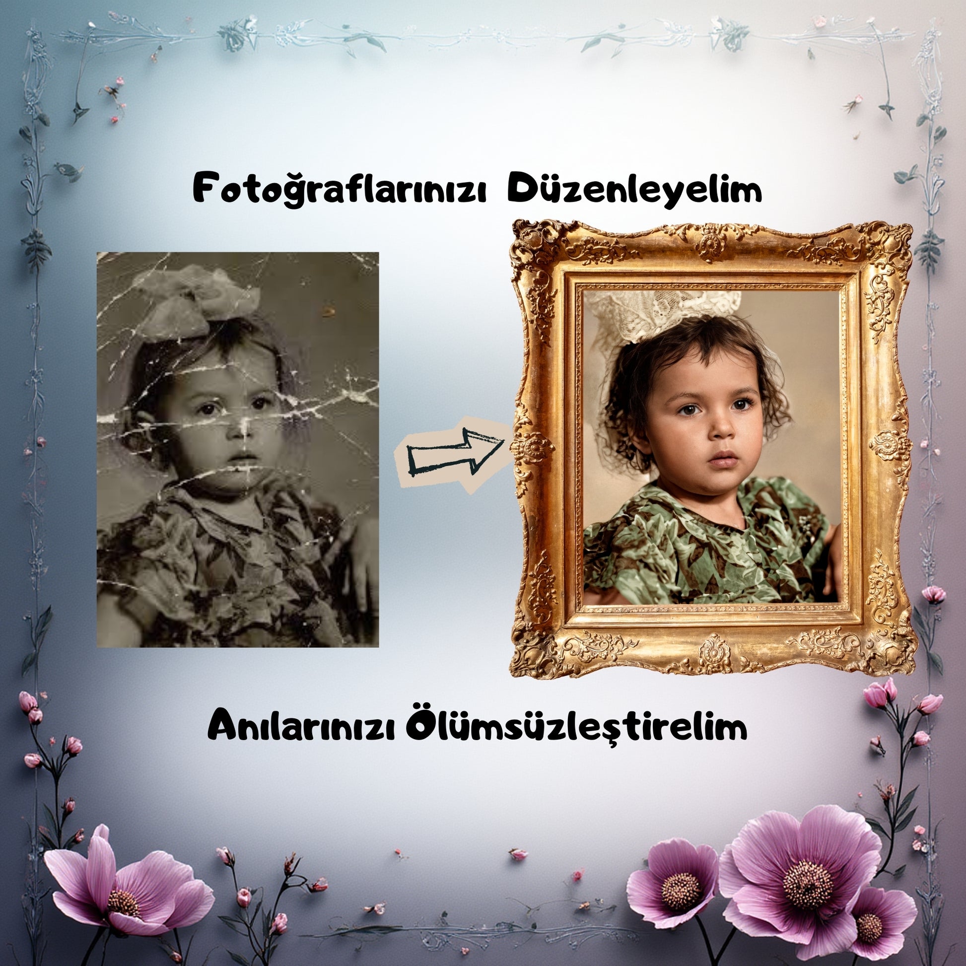 ✨ HANGİ SORUNLARI ÇÖZÜYORUZ? ✅ Yırtık, çizik ve lekelerin temizlenmesi ✅ Bulanık yüzlerin kristal netliğinde düzeltilmesi ✅ Siyah-beyaz fotoğrafların doğal renklerine kavuşması ✅ Baskı için çözünürlüğün yükseltilmesi